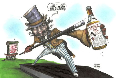 I find the story of Clark Stanley, aka The Rattlesnake King, particularly relevant here. Stanley claimed that he had learned about the power of rattlesnake oil from a Hopi medicine man. Unfortunately, he failed to mention that Chinese water snake oil had three times the content of Omega-3 acids as rattlesnake oil; therefore, the rattlesnake oil was considerably less effective. This didn’t deter him, though, as he unveiled his magical discovery at the 1893 World’s Fair. Joe Schwarcz, the director of McGill University’s Office for Science and Society, describes the scene in this 2008 article: