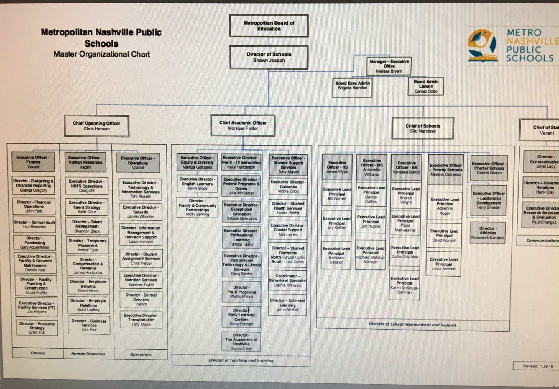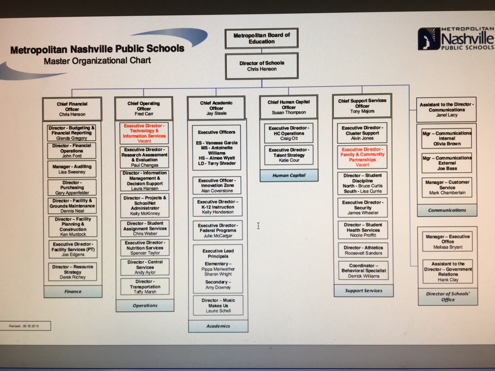 In looking at the two charts, I don’t see a lot of shrinkage happening. In fact the opposite of what the board has been calling for seems to be happening. I’m not arguing for justification, and shrinking central office may have been the wrong directive, but where is the money coming from? And why is it necessary to pull people from outside of the district to fill these new positions? Did we have nobody competent enough who was working previously in Nashville? Because that’s the impression being given. It seems like no one in Nashville is good enough, and that is ridiculous considering that there was some exceptional work taking place before Joseph was hired. Pre-K, the Academies, English Language instruction, budget presentation, all were winning national accolades that are now going unrecognized by the current administration.