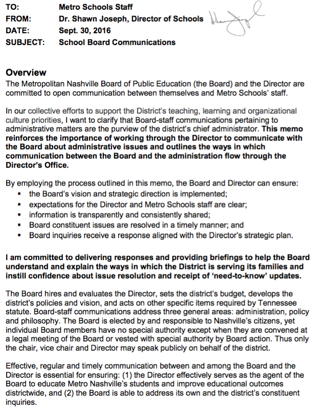 In order to have a healthy organization – Dr. Joseph has previously referenced MNPS as a “sick” organization – it is important to engage in healthy dialogue, but it doesn’t appear that Dr. Joseph is looking to foster a whole lot of dialogue. On Friday of last week, district employees got a three-page memo on how conversations with School Board members need to work. untitled-2What this means is if you are a little concerned about the spending and the hiring and you want to talk to the people in your district that you know and trust the most – teachers, principals, and school board members – then you better follow this protocol to a tee. If you think you can just invite a school board member to visit your classroom, think again.untitled-3