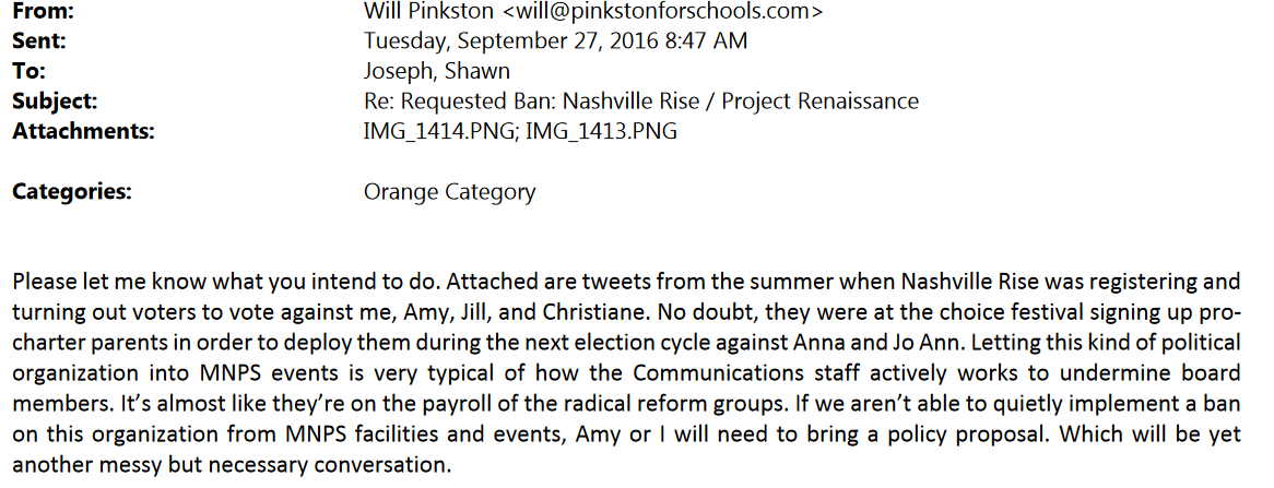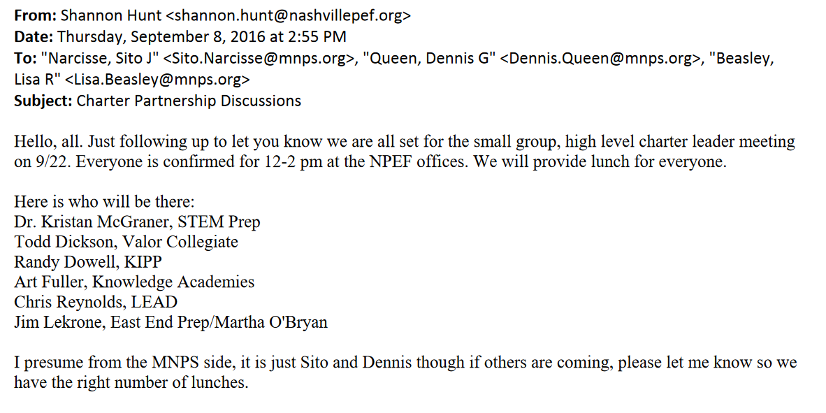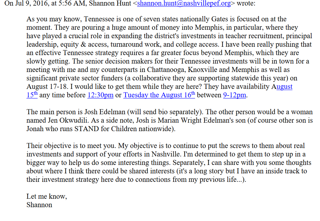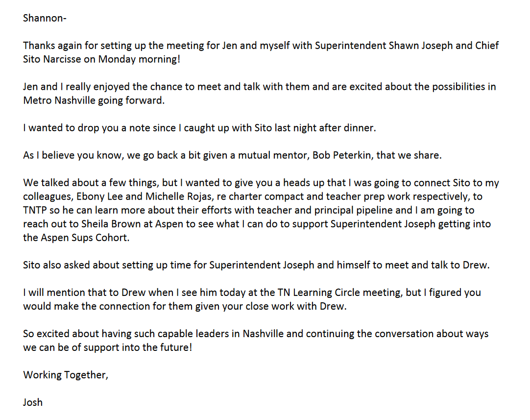Hunt’s email reads like someone who has an agenda to me. Josh Edelman is the brother of Jonah Edelman, who runs Stand For Children, and he seems to be getting a seat at the table in Nashville where his brother couldn’t. In fact, a lot of champions of privatization seem to be getting a seat at the table. The last couple of months have seen Dr. Joseph hire someone who led the fight to create charter schools in Washington for the Chief of Staff position and hire a Broad Academy graduate with no classroom experience as Executive Director of Professional Learning. This doesn’t seen to be congruent with the vision expressed by people during the election. It bears repeating, so it’s crystal clear, that at the same time parents and teachers were working to beat back privatization forces, Shannon Hunt was taking advantage of the access granted her by her position as the head of NPEF to push a personal agenda. One that was certainly not a continuation of the true community driven process that NPEF promised when they agreed to pay for the search. This is why constant vigilance is called for.