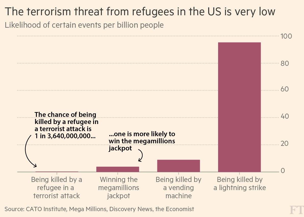 We also need to make a distintinction between refugee children and immigrant children. The two are often lumped together, especially when politically convenient. Immigrant children are brought here by their families in search of a better life. They are from families that choose to come here. Refugee children are from families that are fleeing their home country. It’s two separate populations with two separate sets of needs and challenges. Politicians will tell you the ban on refugees is for our safety, but the odds of being killed in an attack by a refugee are less than winning the lottery jackpot.