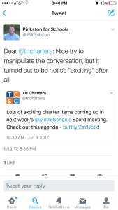 ones that agree with him. Part of the job of school board member is to hear things you might not want to. Let’s be honest, both sides of the charter school debate have been guilty of stacking public commentary. I try to always ask myself, “How would I feel if I was in the minority and this tactic was used against me?” What comes around always goes around.