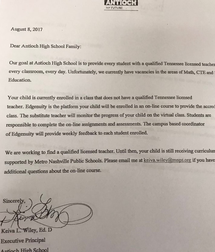 Now, moving on. Things continue to unravel at Antioch High School. This is a school that 2 years ago was a level 5 school. Last year the school lost 67 teachers. They’ve already lost 3 this year. Students last year staged a walkout in response to a number of issues directly related to leadership at the school. MNPS Director of Schools Shawn Joseph defended principal Dr. Wiley, whom he brought in from Prince George’s County in Maryland, where she was an assistant principal. In his eyes, she’s been doing good work. This week, a letter went out to parents informing them that the school currently had teacher vacancies in the areas of Math, CTE, and Special Education. Students who are enrolled in classes that do not have qualified, Tennessee-licensed teachers will be enrolled in an online course called Edgenuity. A substitute teacher will monitor progress of the children enrolled in the virtual school. Now help me here… where does this fall under “Exceeding Expectations”?