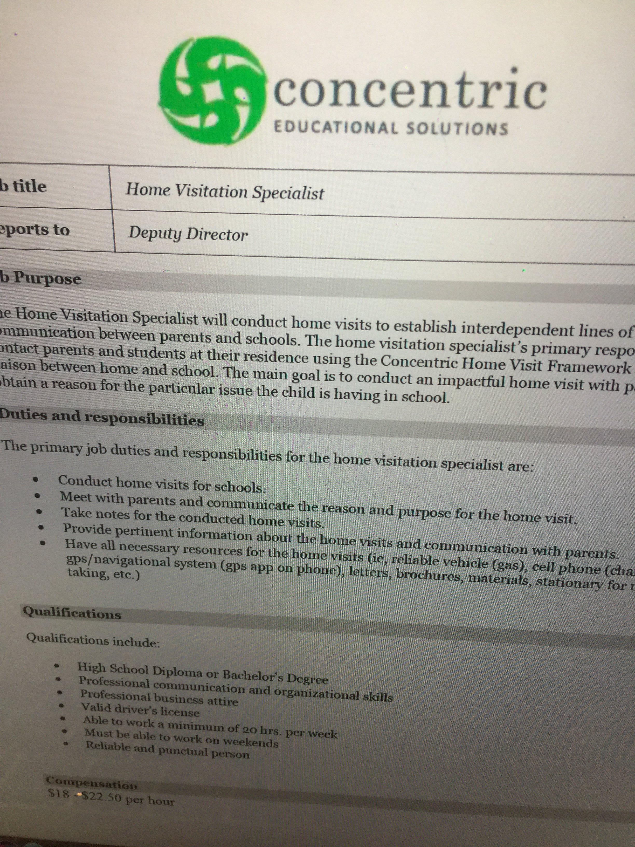Just so you understand how this works, the priority school office is engaging a company from their home state to manage 1099 employees from Nashville to go into the homes of families from 4 priority schools – Joelton MS, Jere-Baxter MS, Madison Middle, Napier ES – whose children have been flagged for attendance issues.Thinking that sounds like a neat job and you wonder if you are qualified? All you need is a HS or Bachelor Degree, business attire, and a cell phone with a GPS apps and you could be doing the work of professionals.