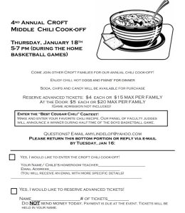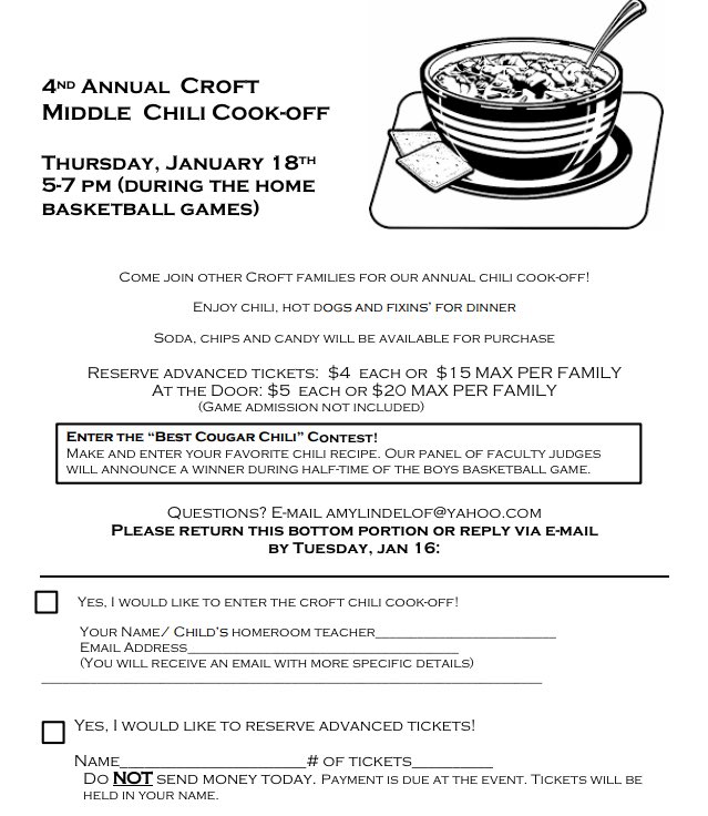 Last, but certainly not least, mark your calendar for Croft Middle’s Chili Cook-Off. Should be an excellent time for all.