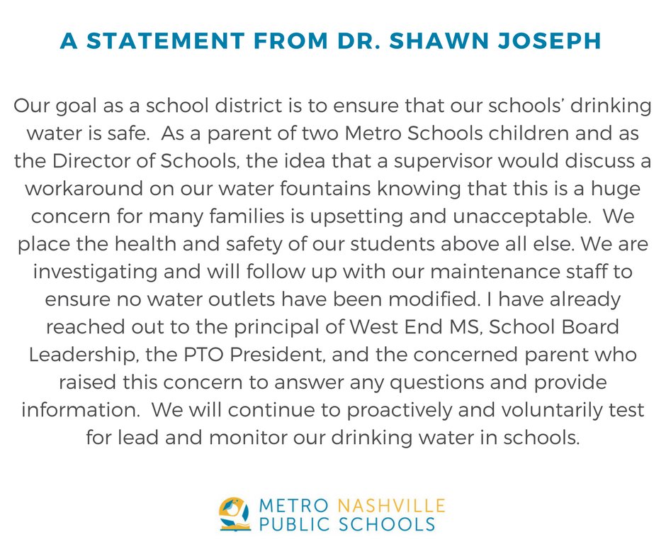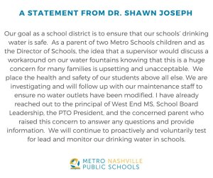 On Monday night, Phil Williams aired a story on Channel 5 that centered on a recording of MNPS’s head of facilities discussing bypassing the warning lights on water filters designed to protect kids from lead in the water. The story was picked up and the CBS Morning show did a report on Tuesday. Amid the furor, Joseph released a statement via a tweet accompanied by the claim that “For the past two years, we have been proactively working to make sure our drinking water is below the recommended guidelines set by the EPA. Our goal as a school district is to ensure that our schools’ drinking water is safe.”