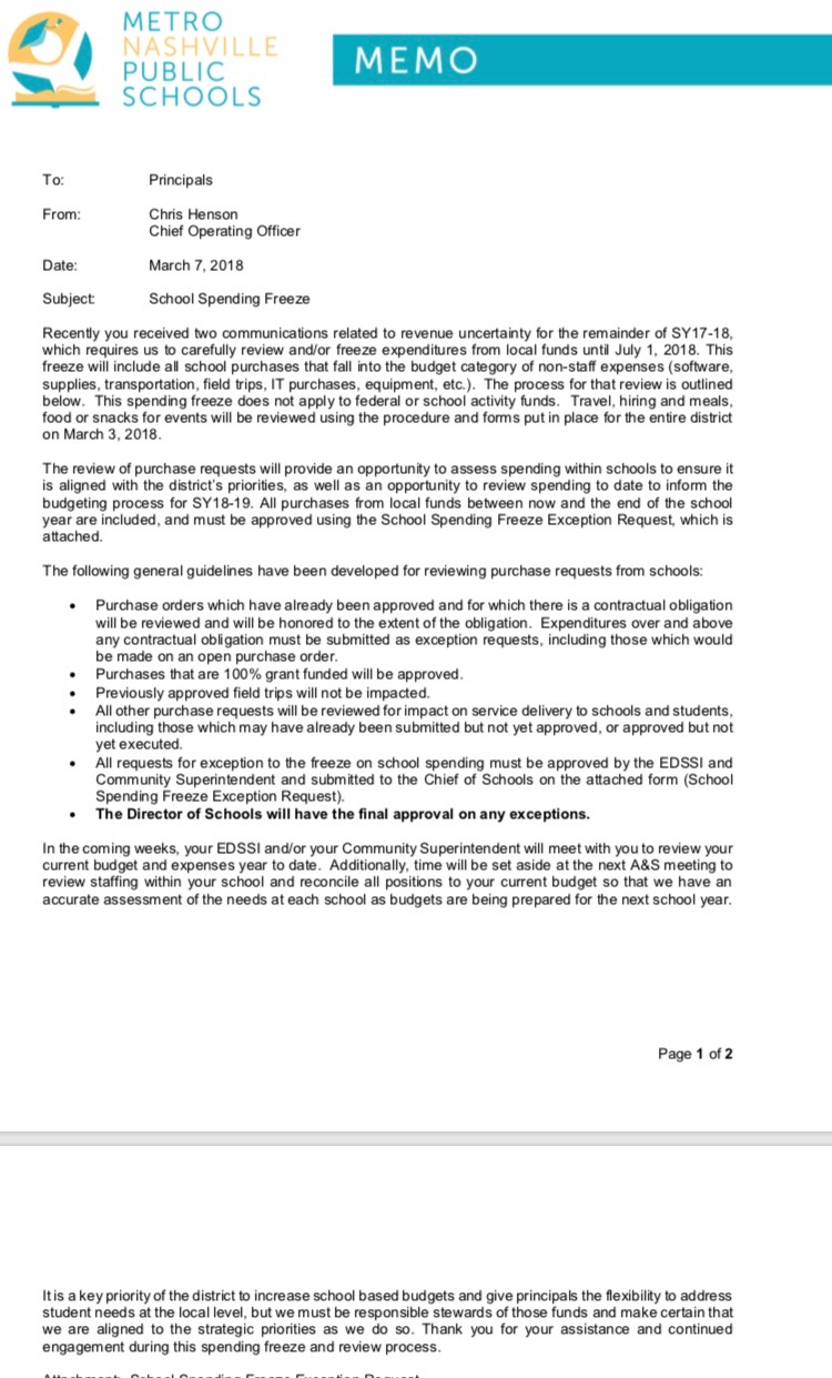 • “We would not let any school go without paper.” That one produced a collective, “Huh??!?” from principals. Up until yesterday, all budget exception requests were being returned from central office marked denied. Many of those requests were for funds for paper. In fact, Overton HS parents felt so concerned that they created a paper drive. Joseph has stated that people have just misinterpreted the freeze, but the directive seems to have made things pretty clear to me.