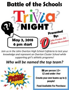 Trivia night is coming to the Overton Cluster on May 3rd at 6pm. It’s a little friendly competition between schools in the cluster. I think it could be a lot of fun!