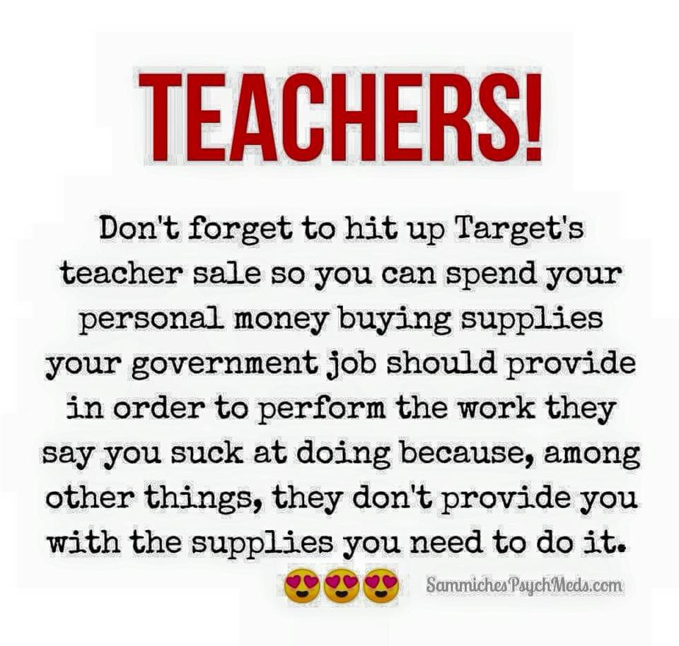 number directed at educators. I guess we are just not pretending anymore, and it’s become an expectation that teachers will utilize their own funds for school supplies. That’s not okay. Teachers, I urge you to resist this subtle entrenchment.