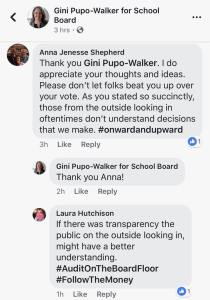 In her postings, Wagner claims to have seen Bush commit election law violations, but fails to identify what they were. Of course she also fails to acknowledge that Hunter has yet to file campaign disclosures. In light of her personal feelings, one has to wonder if Wagner can be effective as a union representative. Especially in light of the growing alliance Bush has with Frogge and Speering, two long-term, ardent supporters of teachers. Perhaps it is time for Wagner to eat a little crow.