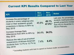 This oversell process continues when you get to the 35-minute mark and data guru Paul Changus steps to the microphone to give an update on the districts key performance indicators(KPI). Look at the first KPI and it shows the district up-ticking by roughly 4% points. Ah, but that’s not an accurate number because it includes students that did not get accommodations – text-to-voice, read aloud – on previous tests but received them on the latest. Factor those numbers out and we are a mere 1.2% points higher.