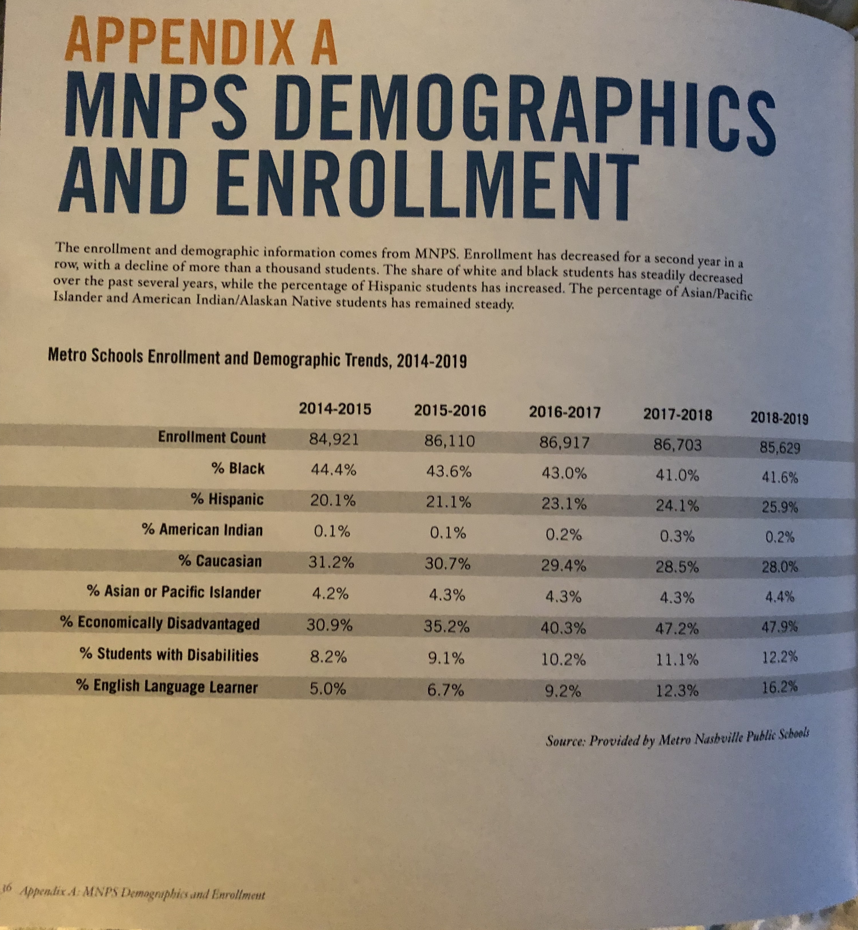 Drop down a couple of lines on the demographic chart and you’ll see my biggest cause for concern, % Economically Disadvantaged. That number has grown from 30.9% in 14/15 to the current rate of 47.9%. Knowing what we know about the impact of poverty on kids, a growth of that magnitude should be a source of alarm for all of us. Instead of talking about the cool new places to eat in town, the mayor should be talking about the families Nashville is leaving behind and how we are going to address that issue.