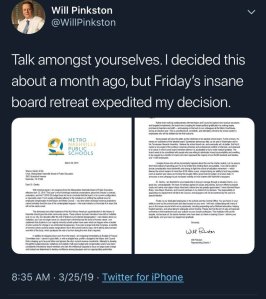 With that said, I don’t think this fire is nearly as large as people might initially perceive. Despite the fiction evoked in his resignation letter, Pinkston hadn’t really done any work on the budget. He took over 6 weeks ago for Anna Shepherd at her request due to personal issues, and as chair had minimal impact. At Friday’s board retreat I watched all board members, sans Pinkston, have a reasonable and productive conversation over the budget. There was nothing that was as Pinkston described, insane. Nor was the meeting “contentious” as reported by Nashville Public Radio.