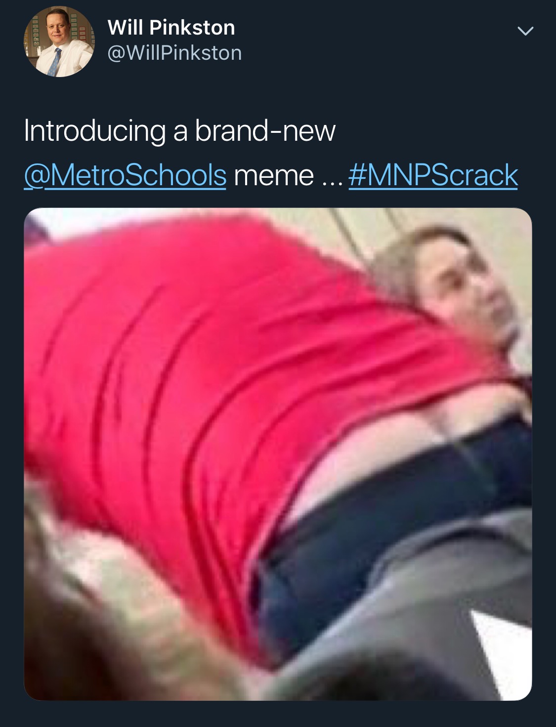 The inadvertent plumber’s butt shot that Pinkston shared was enlarged from footage the News 5 camera inadvertently caught during the Friday MNPS School Board retreat that Pinkston failed to attend.  He, or one of his minions, blew up the shot and pinned it to the top of his Twitter feed on Friday and it ran all weekend.