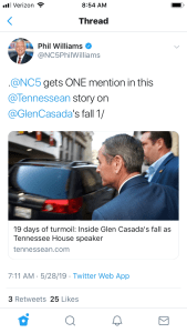 This morning the Tennessean ran an interesting recap of invents in the Casada tale. It’s a recap that downplays News Channel 5 and their reporter Phil William’s role in exposing Casada’s immoral actions. Luckily, Williams is well versed in Twitter and he takes the time to correct the record. Without both news outlets, I’m not sure that Casada wouldn’t have ridden things out though until he actually resigns I’m not willing to write his epitaph either. As Williams points out, competition is good but let’s give each their due credit.
