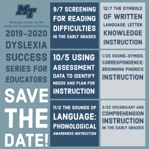 The 2019-2020 Dyslexia Success Series for Educators presented by the MTSU Center for Dyslexia is fast approaching. Be sure to make plans to attend. I’d also like to use this opportunity to thank Tennessee State Rep Bob Freeman for all of his hard work this year towards Dyslexia legislation. Hopefully, next year will bring even more success.