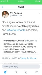 But it’s not just charter school parents for whom an appalling lack of concern is shown. Later in the budget meeting, Pinkston alludes to those who are “clued in” being aware of the state circling around for a potential district takeover or at least a take over of the Whites Creek cluster. He dismisses further conversation of the subject with a summary statement of. “we’ll fight that off after the mayoral election.” WTF?