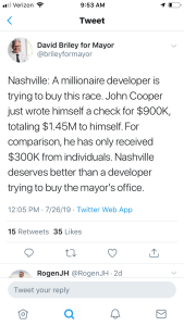 My favorite WWE moment has come courtesy of Mayor Briley who tweeted out on Friday that John Cooper was attempting to buy the election through his developer cronies. Take a look at Briley’s contributions and you’ll find the majority have ties to the Chamber of Commerce crowd. Including a $20k donation from the Nashville Business coalition.