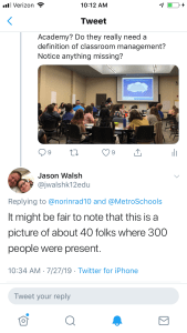 Several folks pushed back against my criticisms of pictures posted last week from MNPS’s new teacher training. Fair enough, the picture may not be fully inclusive, but let me ask a few questions. If this is only one corner of the room and all the teachers of color are in another corner, isn’t that symptomatic of a problem? If I’m a TOC and I’m weighing whether to come work at an MNPS or another district how will this picture impact my decision? If I’m a parent of a student of color, who will this picture ally any fears of inclusion that I may harbor?
