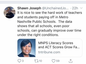 Of course, Dr. Shawn Joseph couldn’t wait to twist results for his benefit. The former MNPS Director of Schools is out waving his flag of success with help from the Tennessee Tribune. Per the Tribune, MNPS outpaced the state in growth and “On Track or Mastered for English Language Arts also increased for grade spans 3-5 and 9-12.”.