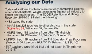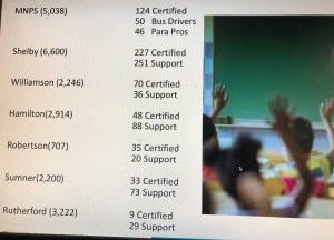 Majors begins his talk by laying out the shortcomings of other Tennessee school districts when it comes to staffing. I’m not sure where these numbers are derived from but a call to Shelbyville schools put their openings at approximately 60 – predominately in SpEd and Middle School. Williamson County is reportedly between 24 and 26.