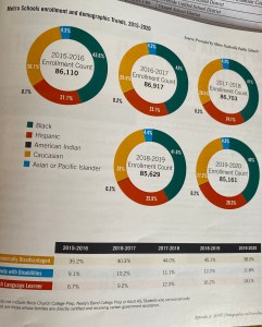 Next, is a chart that shows the districts of each school board member and the number of schools and students in their district. This one is an eye-opener. Look at District 5 – 42 schools and 8,691 for an average of 207 students per school. District 6, in contrast, is 20 schools and 16,865 students for an average of 843 students. District 5 is 82.4% non-white, while district 6 is 79.2% non-white. In district 5 those numbers are made up primarily by Black students, in District 6 they are Hispanic. Hmmm…seems like an equity conversation needs to take place around these numbers.