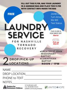 Can you commit to doing a little extra laundry over the next few days?  If so, you will help provide clean laundry for storm victims who are displaced or without power. School board member Amy Murrell Frogge and Lynn Hoyt are coordinating drop-offs and pick-ups between HG Hill and Riverwalk. The plan is to have people pick-up and drop off once a day with the goal of a 24-hour turnaround.  Pastors for Tennessee are throwing in their assistance as well. Donate time and a little soap. Big impact! Sign up here.