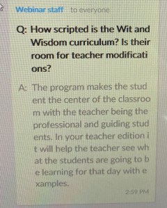 On Wednesday I took a little time to participate in a Webinar for Wit and Wisdom. It was an informative presentation that allowed me to ask several questions about their textbooks and associated curriculum. Questions primarily around alignment with a Balanced Literacy philosophy.