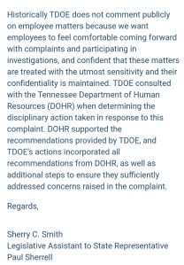 When a constituent raised the question of propriety in regard to the level of punishment Houghtlin received with their state representative, this is the answer they received, one that was less than reaffirming. Apparently, the State’s HR department, under Governor Lee’s tutelage finds Houghtlin’s actions to be a minor offense.