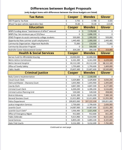 This week we will see city budget talks for next year begin in ernest. Focus will be on three competing visions – Mayor Cooper, Council Member, and Budget Chair Bob Mendes, and Council Member Steve Glover. The Mayor and Mendes’s budget calls for a large tax increase with the budget chair’s increase being higher and awarding more money to schools. Glover calls for a lower tax increase, an increase in the wheel tax rate, and cuts to services. Fellow Council Member Dave Rosenberg has created two charts that help illustrate the differences between the 3 budgets both in intake and outflow.