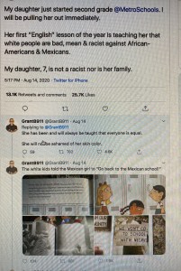 The book in question is a beautiful and inspirational story about early efforts to desegregate California Schools. I would question the appropriateness for second graders, but at the very least it shouldn’t have just thrown out there with no guidance from teachers. Some of the pictures illustrating behaviors of the past could serve to create divisions where unity is desired without a teacher’s careful hand introducing the complex themes and emphasizing the need for inclusion. Introducing a book of this magnitude while relationships between students and teachers are still developing is incredibly insensitive.