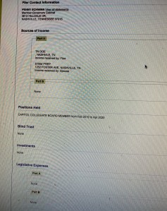 While we are talking about Ms. Schwinn. A few weeks ago I mentioned that according to IRS filings, she had been getting paid a substantial salary from her California Charter School – Capitol Collegiate Academy – while serving as a high ranking official for both the Delaware and Texas Departments of Education. She maintains that those payments stopped once she became Education Commissioner in Tennessee. A claim backed by her 2019 financial disclosure filed with the Tennessee Department of Ethics. I do have a question though.