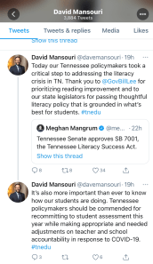 For me, the most valuable thing that happened during Special Session was when Commissioner Schwinn testified before the Senate that 3rd-grade TNReady wasn’t a reading test but rather a measurement of knowledge of Tennessee ELA standards. Think about the significance of that for a minute, the Commissioner regularly makes commentary on the skill level of Tennessee students based on data that is derived from an assessment that she publicly acknowledges doesn’t assess reading. Yesterday, Portland Representative William Lambreth lectured fellow House members to follow the “science” when it comes to COVID, yet he fails to apply the same standard when it comes to education issues.