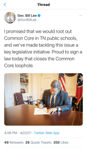 At this point, it would be harder to find a person cashing education checks from the state of Tennessee who didn’t have a long-term affiliation with CCSS. In fact. I think an argument could be made that under Lee, CCSS’s influence has grown. Yet here he is, trying to paint a picture of CCSS eradication.