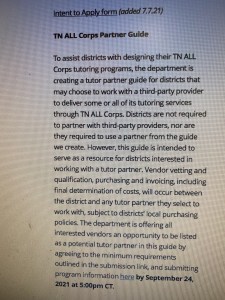 Rep Griffy tried to get some clarity during this week’s Summer Work Session with limited success. This notice from the TNDOE website should shed some clarity on the subject. A guide with partners whom have met the guidelines set by the TNDOE will accompany the check for tutoring services. In other words, here’s your cash, and here’s where we’d like you to spend it. The more things change, the more they stay the same.