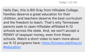 ‘After the huge backlash against @Hillsdale president Larry Arnn saying public school teachers come from “the dumbest parts of the dumbest colleges,” @GovBillLee‘s friends are now texting parents with a PR message that Arnn was “telling the truth.””