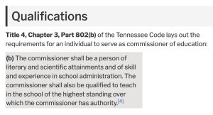 Some social media posters went a step further, pointing out that the Tennessee Code requires the state commissioner of education to be qualified to teach in Tennessee’s schools. A look at TN Compass shows that Ms Reynolds does not hold a Tennessee teaching license. That could be an issue.