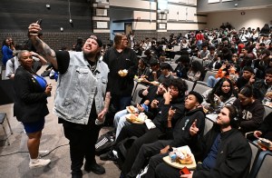 Country music star Jelly Roll surprises students at his alma mater, Antioch High School, during lunchtime on Tuesday, Feb. 25, 2025.
